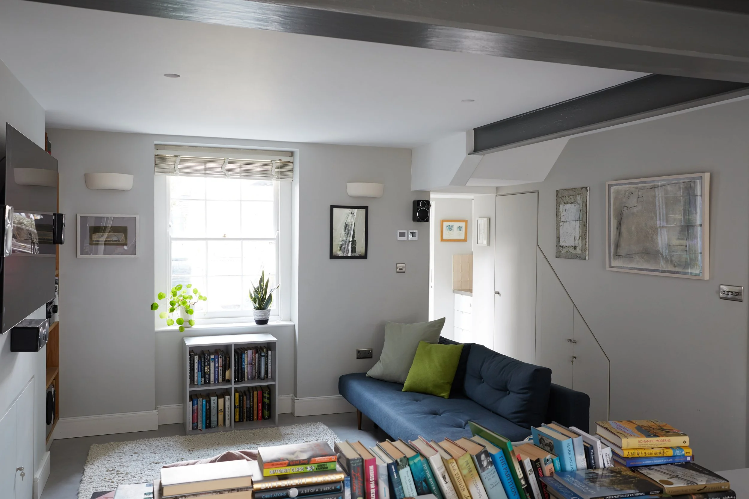 Re-modelling and total refurbishment of a dilapidated one bedroom lower ground floor flat within a Victorian terraced house. The brief was to open up the entire floor plan to create an open plan home work studio for a film producer, with flexible desk space and a home cinema area. There was also the need for a guest bed, along with a new kitchenette and shower room for the busy working studio. A paired back feel was desired, which was acheived by keeping the steel beams exposed where possible and installling a polished concrete floor.